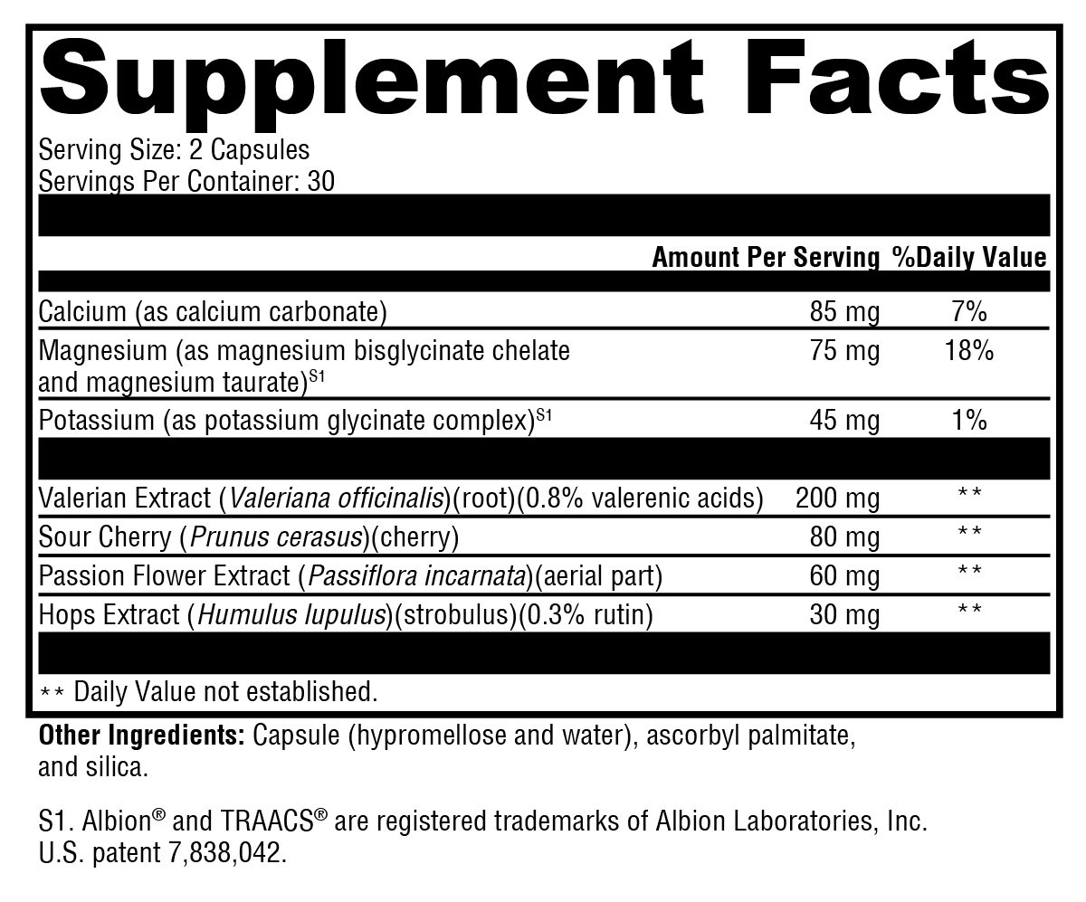 Includes valerian root, passion flower, sour cherry, and hops—botanicals historically used to calm nerves, reduce tension, and support restful sleep.